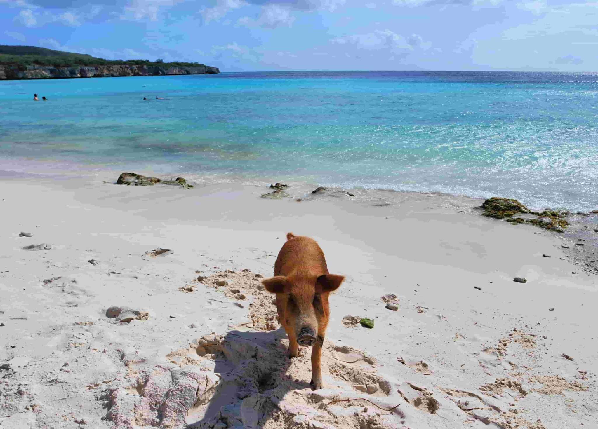 What really makes this beach special? It is home to friendly roaming pigs, originally known as Willy and Woody, now joined by four new residents: Max, Lia, Wim and Meur. The pigs occasionally take a dip in the water and hang out relaxed in the shade or on the sand, looking for snacks.